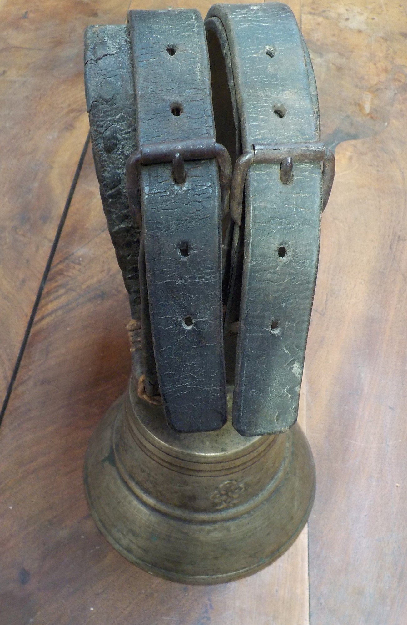 L'occasion ne vous sera pas souvent donnée de tomber sur un tel type de collier. Pour le moins surprenant. Sans doute pour enlever plus facilement la cloche à la vache qui la porte. Marre pour le paysan de tirailler sur les cuir si rigides pour sortir les pointes de la boucle des deux trous du cuir.
