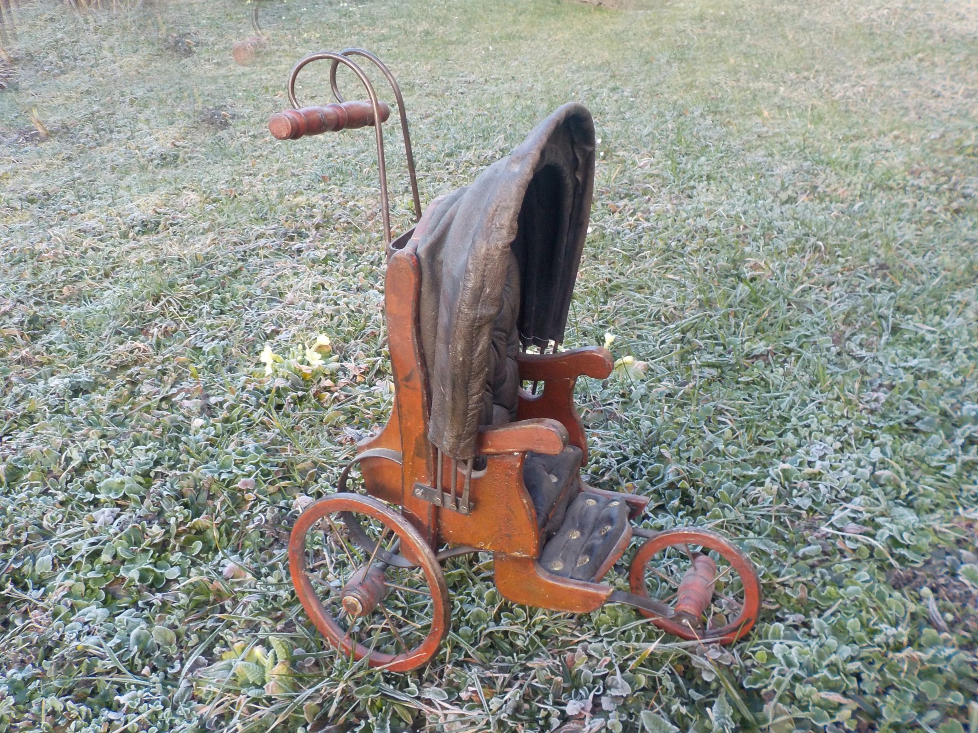 On avait déjà vu une poussette de même style lor de l'Exposition "L'enfance de l'art", en 2023. Simplement que celle-ci avait comme d'ordinaire quatre roues, tandis que la ci-présente, d'une élégance plus poussée, n 'en a que trois. Belle pièce que nous avons estimée avoir été dans les mains de Rose Guignard qui nous raconte à quel point elle aimait les poupées!