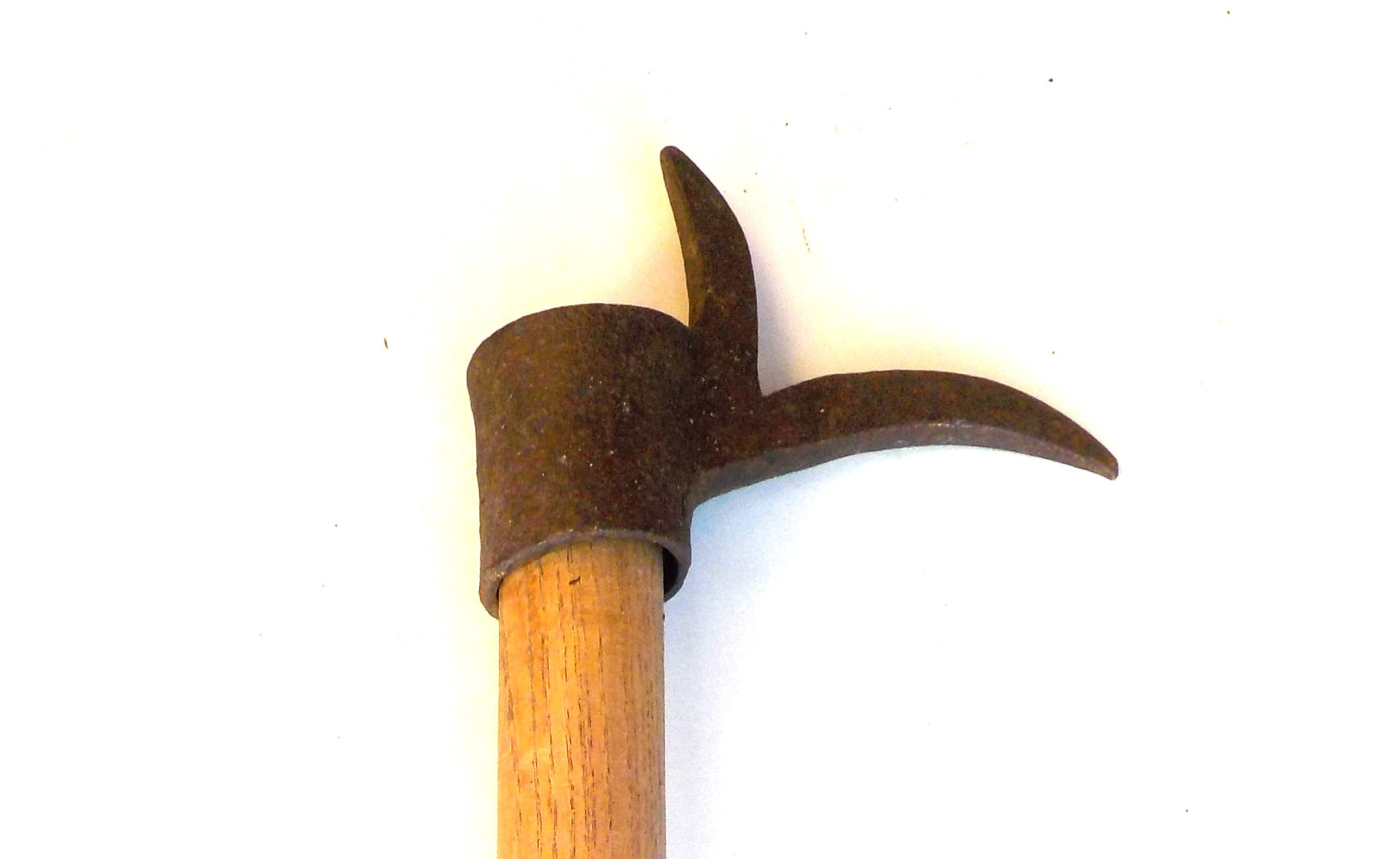 Le grespi est un outil de pompier. Le fer, placé au bout d'un long manche voit en retrait une boucle par laquelle on passe une corde. Celle-ci servira, alors que le grespi travaille une poutre en flammes afin de la faire tomber, à tirer la dite plus facilement qu'avec le simple crochet du grespi. De tels objets se trouvent-ils encore aisément ? La question est posée. Celui que nous vous présentons ici est incomplet de sa boucle et surtout son manche est de beaucoup trop court.
