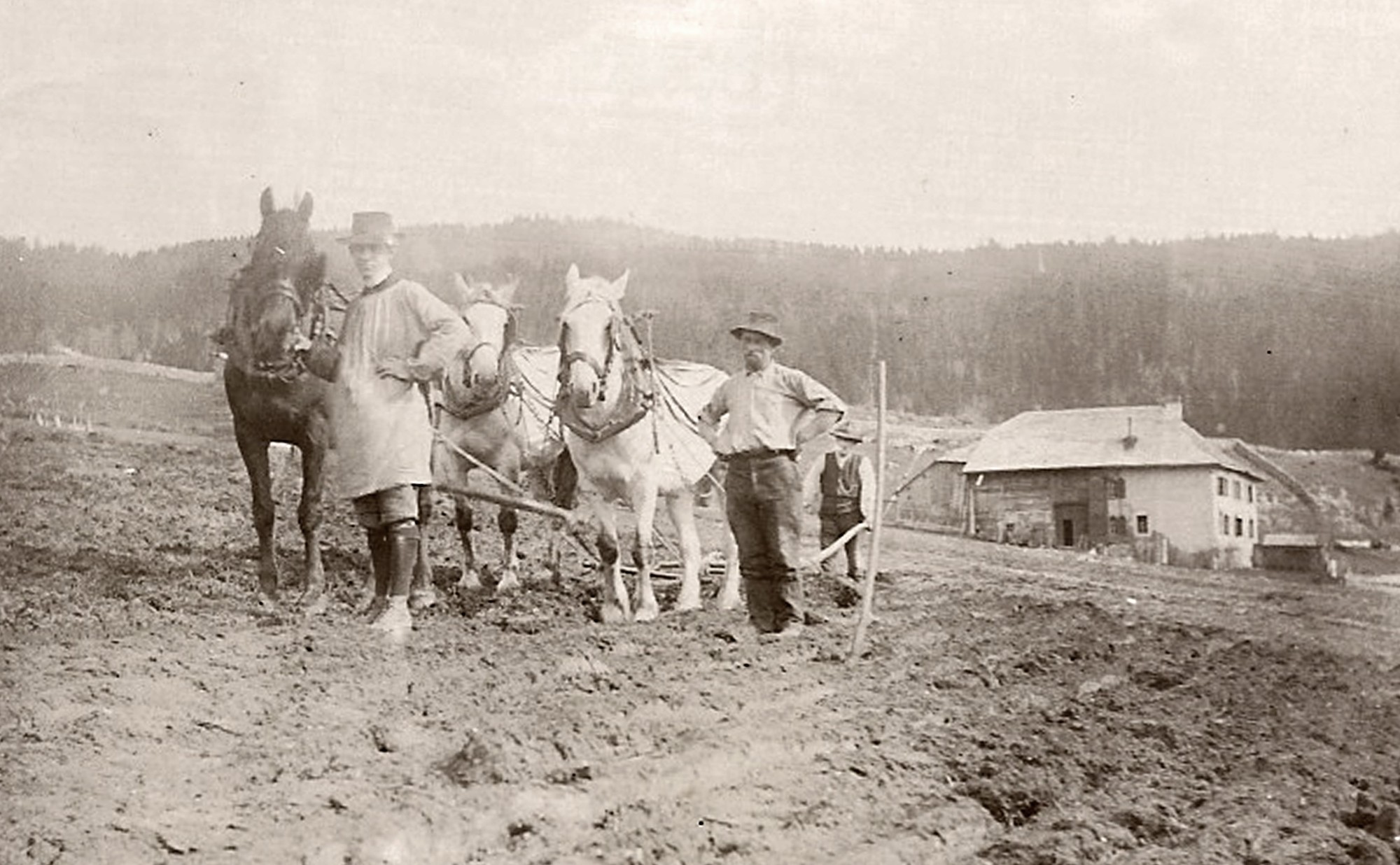 Le type de charrue que l'on voit ci-dessus, sur cette magnifique photo d'une scène de labour au Mont-du-Lac, est un type du XIXe siècle, avec un soc accouplé à un double grand manche dont le but est de guider de manière plus ou moins précise la charrue dans la terre pour créé un joli sillon. Tout un art. Et surtout un gros boulot. Avec surtout ce fameux mollard du bas qu'il faut toujours remonter.
