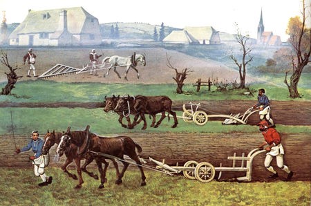 Vieille image qui montre que la charrue est de très ancienne utilisation et que la herse, pour affiner la terre après les labours l'était aussi. Il en existe naturellement de différentes formes comme aussi de différentes contructions, certaines entièrement en fer, d'autres, plus primitives, entièrement en bois. . L'engin est lourd, il est même dangreux avec ses grandes pointes. Il n'est que rarement sympathique, n'en déplaise à ses utilisateurs!
